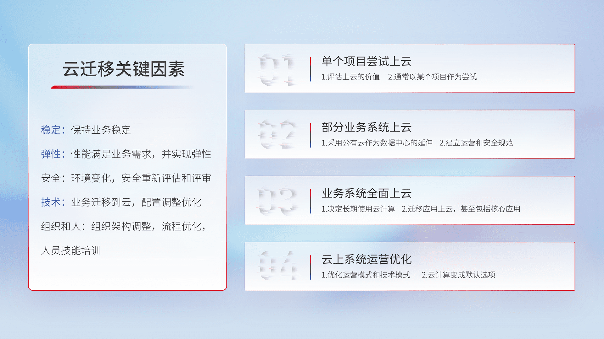 结合实际业务,,从规划设计、、云平台选型、、、云原生改造、、、数据迁移、、、、集成交付,,,迁移全过程为客户识别最佳上云路径,,,做好风险识别管理,,,设计网络架构、、身份权限、、、安全审计合规、、操作审计、、、、日志审计、、、监控告警策略、、、、多站点容灾设计等,,,对云上基础设施进行整体规划,,,,提升IT治理水平,,以满足弹性、、高可用、、高性能的需求。。。。
