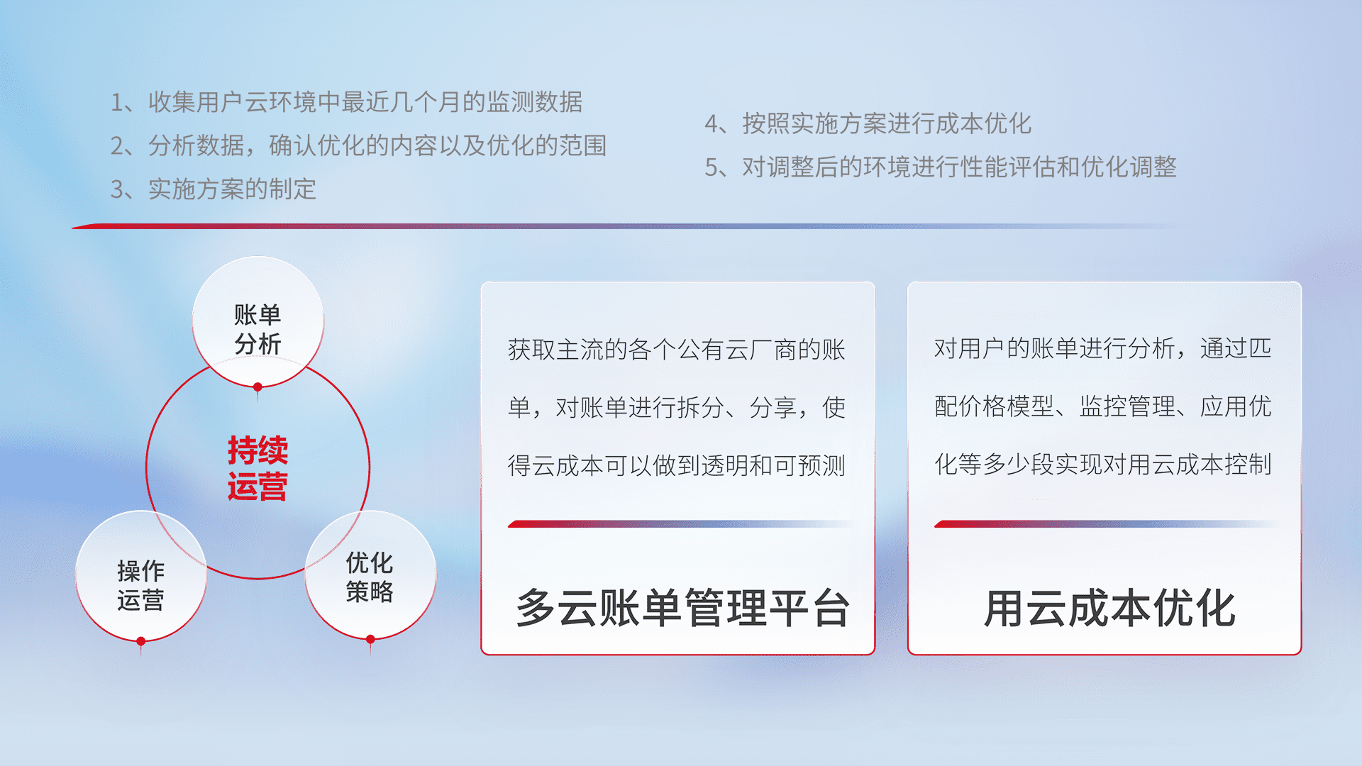 通过多云纳管,,,以统一的资源数据模型把客户的云资源进行抽象和封装,,,,进而实现对多云资源的统一操作,,,,保障云资源管理的可靠性、、、、稳定性与可用性。。量身定制化运维内容,,,,配置、、、、开发运维、、补丁管理、、、、备份、、监控、、、、认证和访问管理、、审计和日常巡检等,,,保障在用云过程中的可靠度,,,,稳定度以及高可用率。。。。